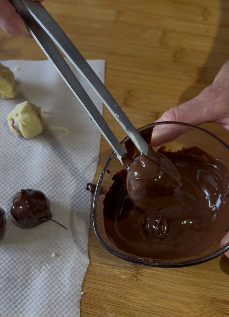 As soon as the chocolate is completely melted, keep stirring it for a few seconds: this will slightly lower the temperature and make it shiny and fluid, just like in a small homemade tempering. This step helps the chocolate solidify well and create a crunchy coating.