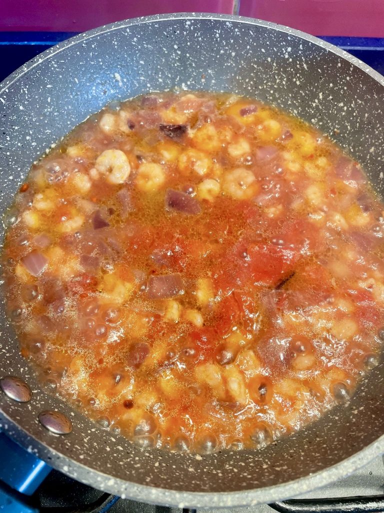 • Bring salted water to a boil in a tall pot. Meanwhile, heat the oil in a pan, add the finely chopped onion and chili, and sauté until golden brown. When the onion is well browned, add the shrimp and cook over high heat. Deglaze with cognac and let it evaporate for about a minute. At this point, add the Worcestershire sauce, tomato sauce, and adjust the salt. Let cook for 5 minutes, then turn off the heat. Blend everything with an immersion blender, leaving some whole shrimp aside to decorate the dishes before serving. When the water reaches a boil, add the pasta and cook it according to the time indicated for al dente cooking. About 30 seconds before the pasta is ready, put the shrimp sauce back in the pan and, as soon as it starts boiling again, drain the pasta with a slotted spoon and transfer it directly to the pan.
