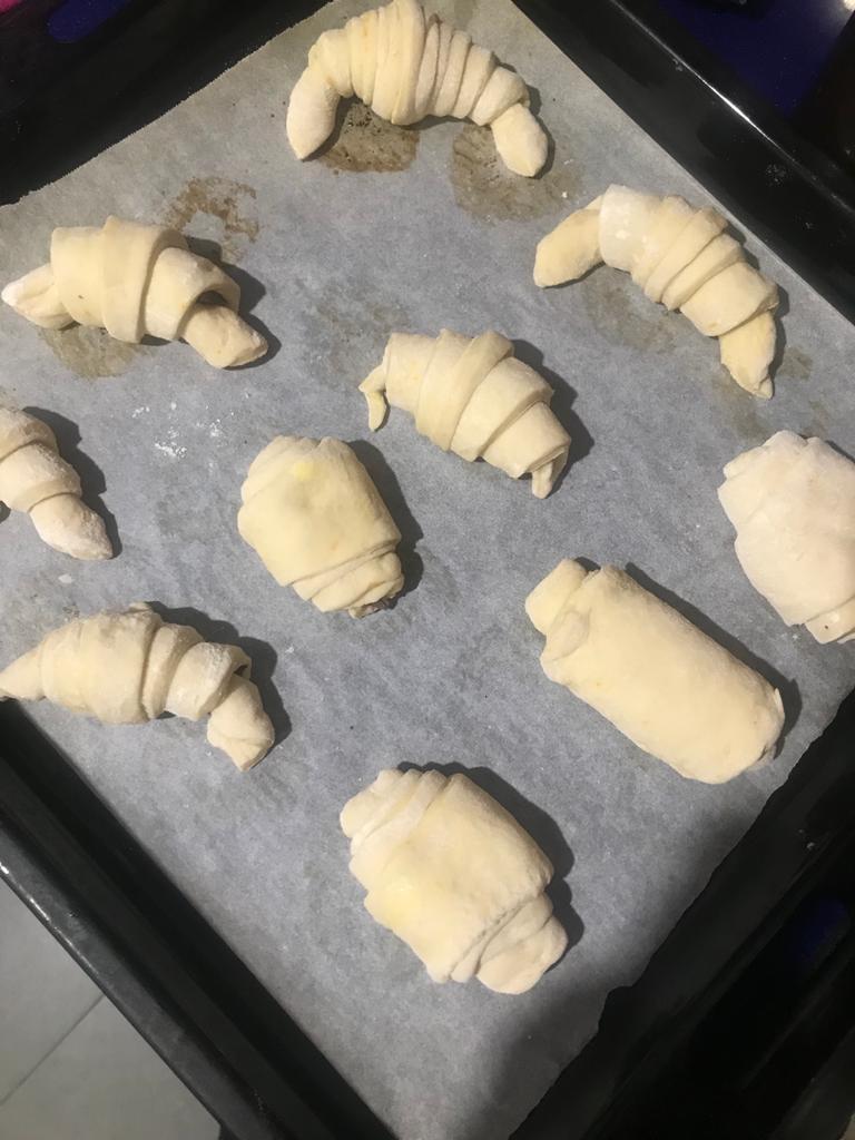 Place the obtained croissants on baking trays covered with parchment paper. I used two trays, and as you can see, I also made small bundles. I filled these with some chocolate using Easter eggs, so we have another way to use them.