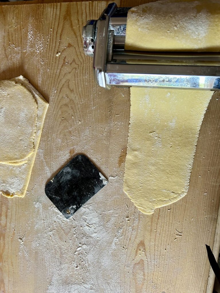 • With the help of a knife or a scraper, divide the dough into 4 or 5 pieces. Pass each piece through the pasta machine, setting the wheel to the maximum thickness because the first passes will be the most “difficult” to then obtain the sheet. Lightly flour each piece of dough before passing it through the rollers and press it with your palm before placing it in the rollers, this will ease the first passes.