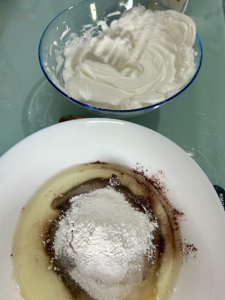 Whisk the egg whites to stiff peaks with clean and dry beaters until you achieve a stable and glossy consistency. In another bowl, combine all the dry and liquid ingredients of the light chocolate cake. Mix with the electric whisk until you get a smooth, lump-free, and well-blended batter.