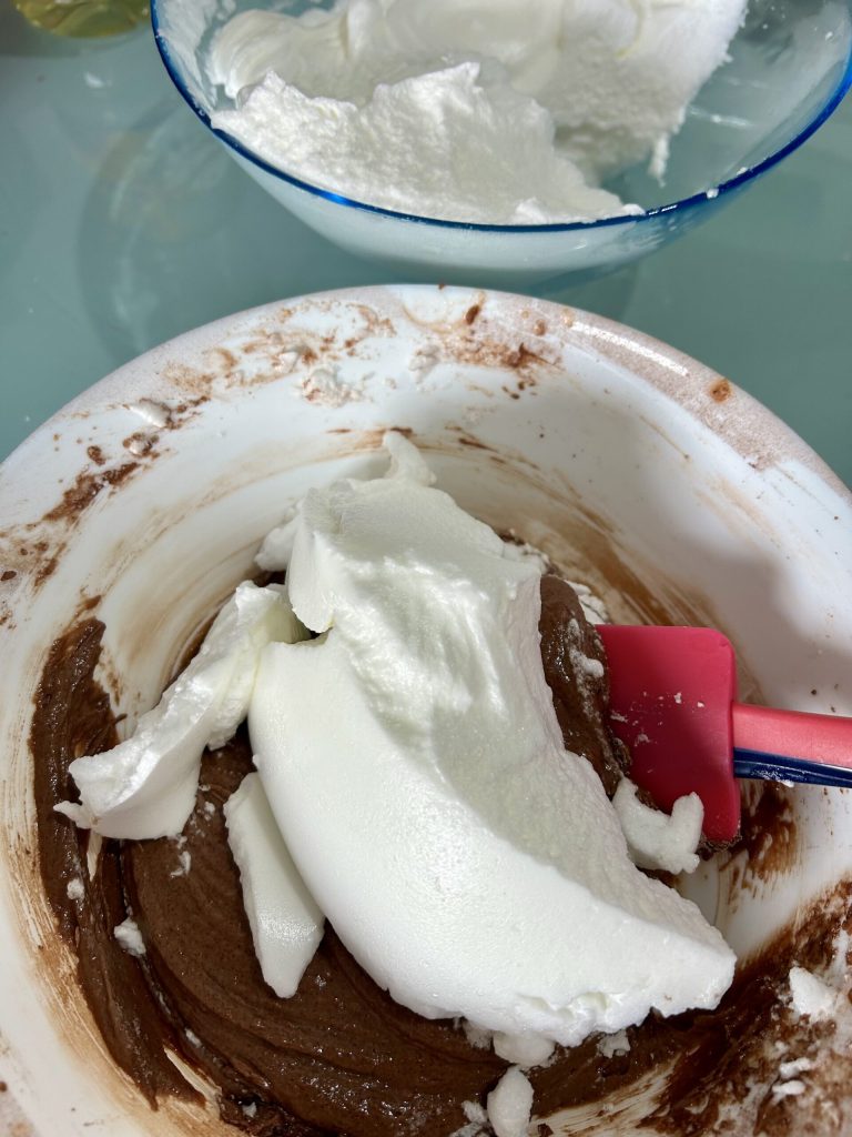 Add the beaten egg whites to the chocolate batter gradually. Use a spatula and mix gently from the bottom up to keep the light chocolate cake soft and well-risen after baking. Pour the batter into a lightly greased 8-inch pan. Bake in the air fryer at 320°F for about 27 minutes. Always do the toothpick test after 25 minutes.