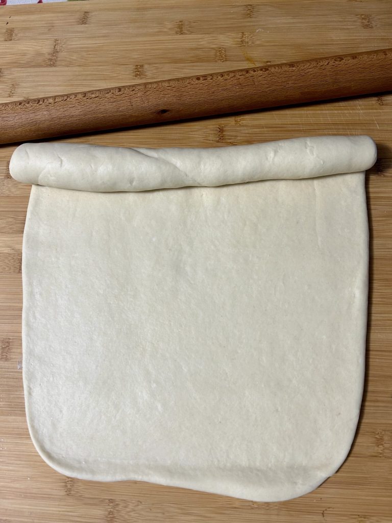 Take the dough and place it on a work surface, like a wooden board, without needing to flour it. Roll out the dough with the help of the rolling pin into a rectangle a little less than 1/2 inch thick. Roll it tightly onto itself, as you see in the photo.
