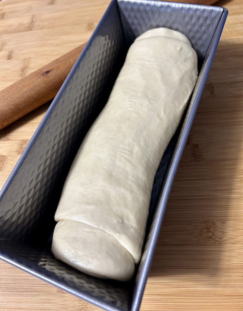 Oil the loaf pan and place your bread roll inside, making sure to position the open part at the bottom. Cover with plastic wrap and let it rise until it reaches the edge of the mold.