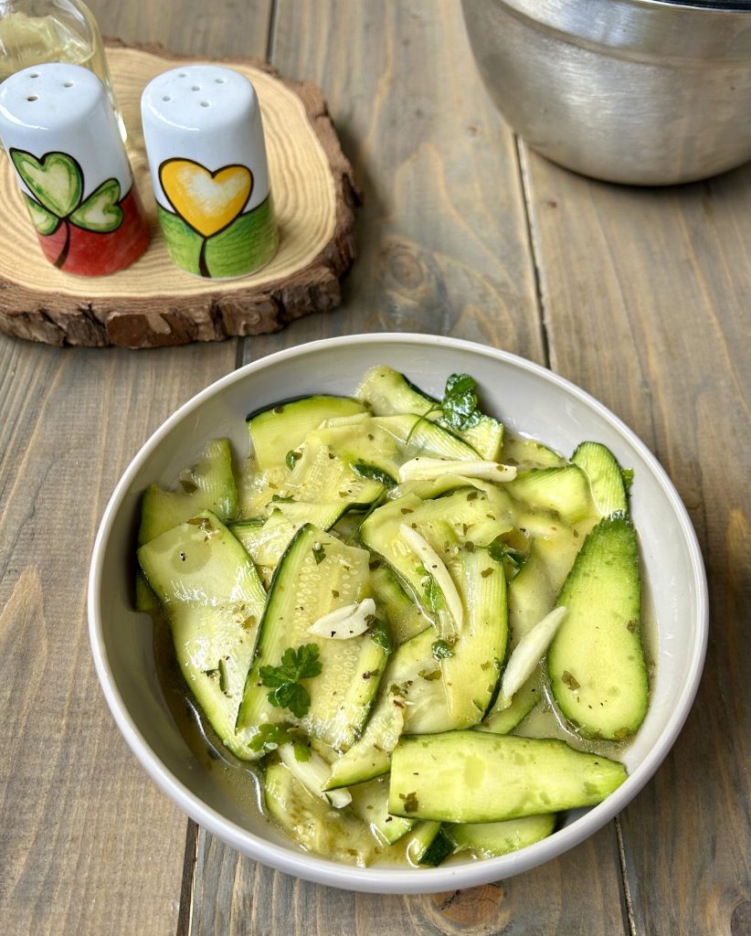 They are prepared in minutes: just thinly slice the zucchini with a mandoline, season with salt, pepper, garlic, parsley, lemon juice, and oil, and then let them marinate in the fridge for a few hours. The result? Flavorful, fresh, and fragrant zucchini, ideal to enjoy with good bread or to take with you for a picnic or work lunch.