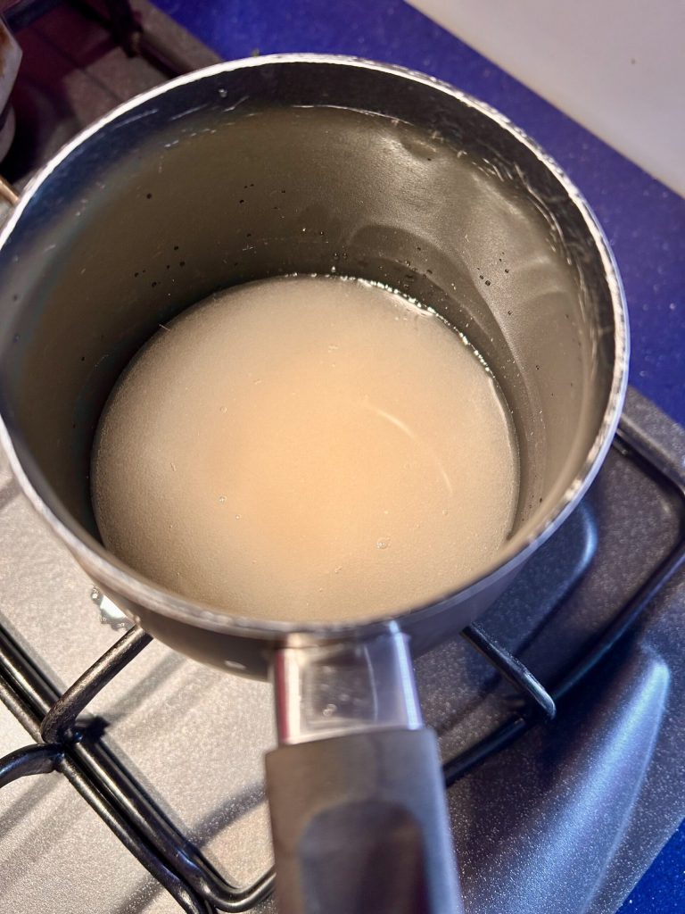 • Put the water in the saucepan with the sugar and bring it to a boil over high heat.