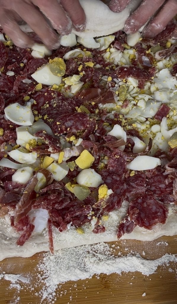 • Place the 3 whole eggs on the surface of the Casatiello and use the reserved piece of dough to create crossed strips over them.