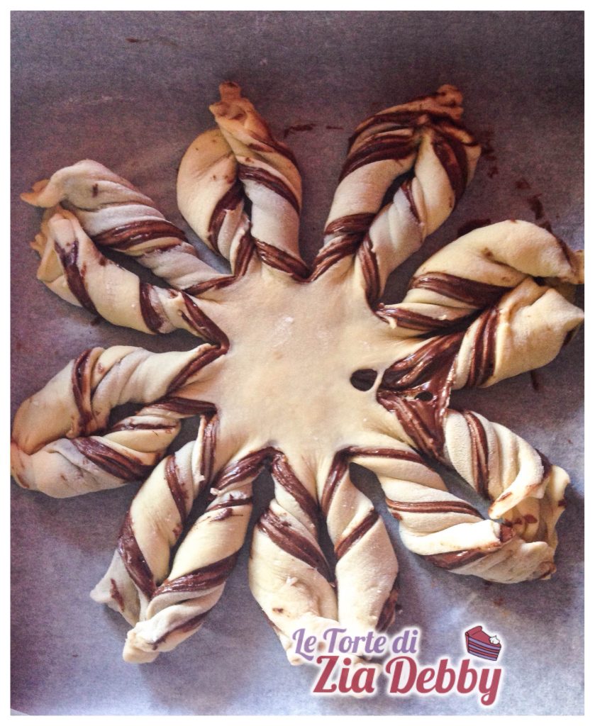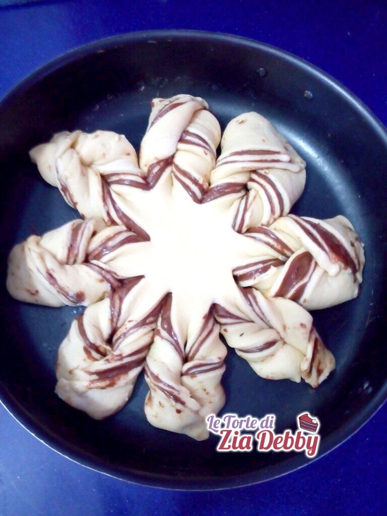 If you want to get a more beautiful and precise Nutella flower, I suggest, as I did last time, to place it in a round pan to rise and bake so as to have a well-defined border. I used a round pan with a diameter of 32 cm. This photo is before the second rising.