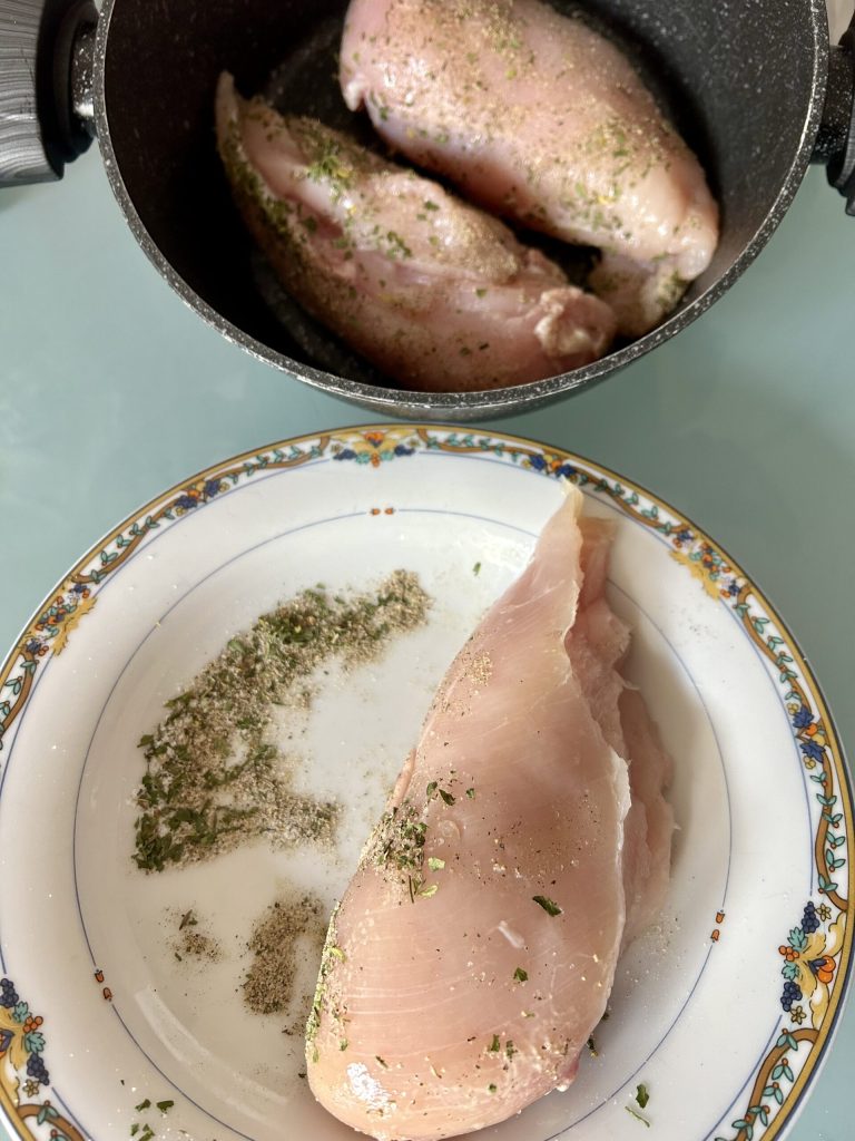 For cooking the chicken breast, I recommend using a non-stick pan to use few fats during cooking, with a diameter of 9.5/10 inches and high edges.