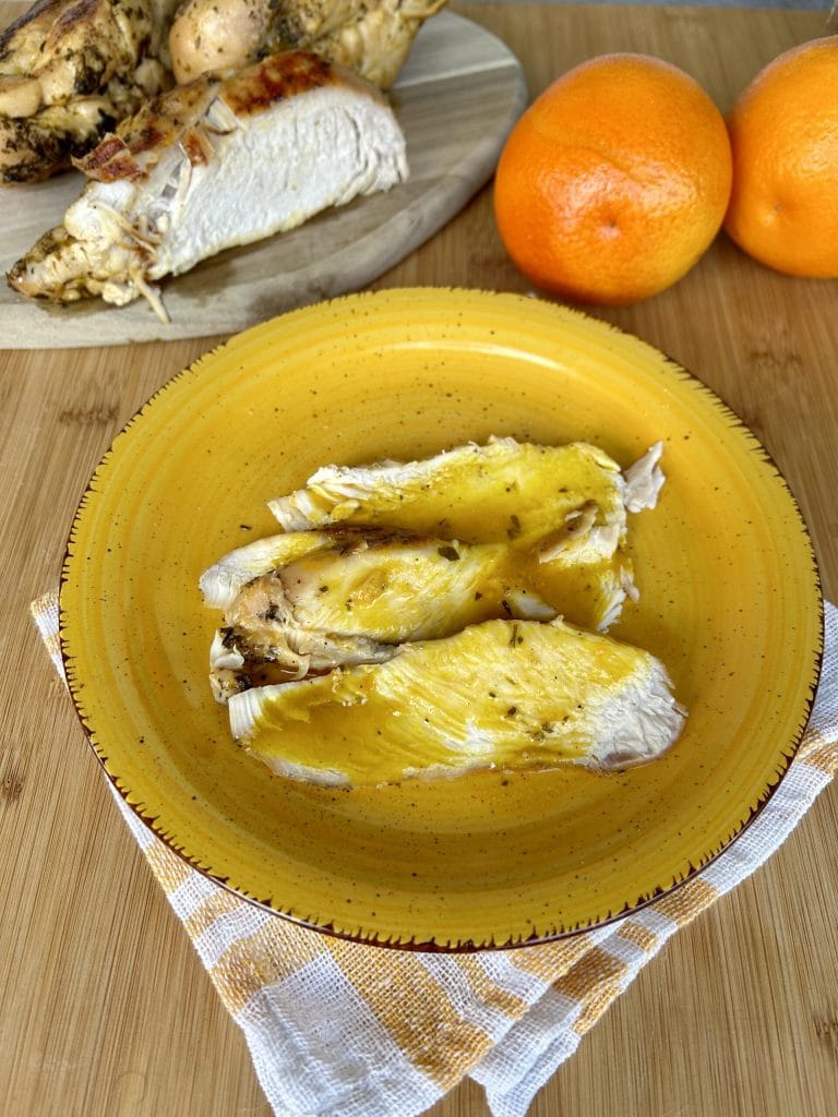 The orange chicken breast, as previously mentioned, is not only a pleasure for the palate but also visually thanks to its colors. It can be prepared in advance to cool the meat better and facilitate slicing, as you can heat it when you serve it, and it will keep its tender and flavorful meat thanks to the orange juice covering it.