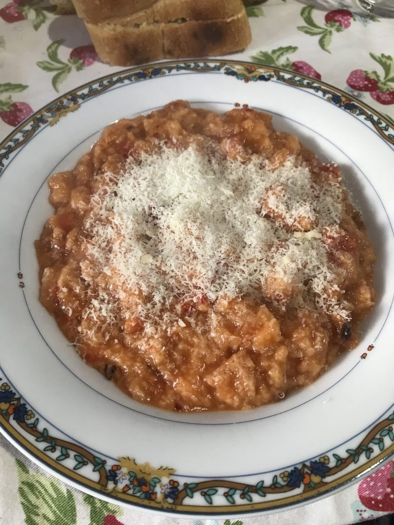 Pancotto is a very simple dish made with bread and tomato sauce, typical of poor Italian cuisine. It reminds me a lot of my mom; she used to make pancotto for me and herself when she wanted to recall her childhood.