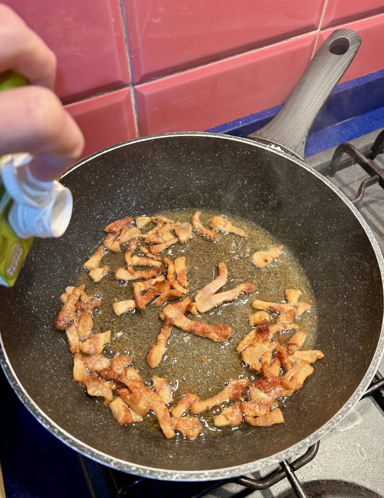 • When the guanciale is nice and crispy, deglaze with a little white wine, let it evaporate for about a minute, and turn off the heat; your sauce is practically ready.