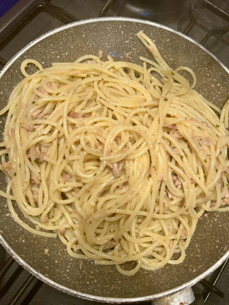The white pasta with tuna is certainly simple to prepare but becomes exceptional by following a few simple rules, such as not draining the pasta using the classic method but instead lifting it with a slotted spoon and bringing it to the hot pan to be tossed, keeping the right amount of water and starch usually contained in the cooking water.