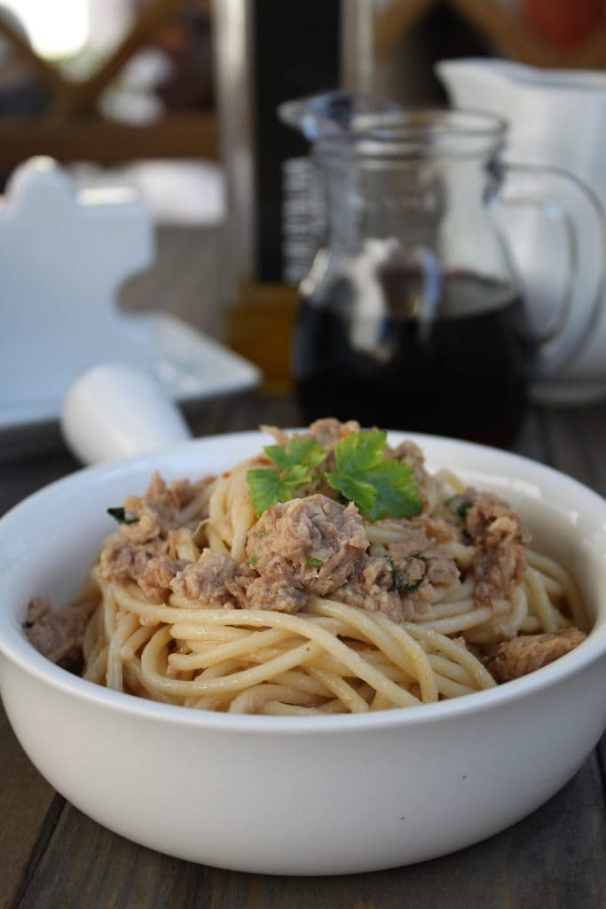 Pasta with white tuna and specifically I used spaghetti, but you can use the pasta shape you prefer. It’s certainly one of the quickest main courses to prepare, very appreciated because with simple ingredients such as garlic, oil, and chili pepper, it acquires a lively and bold taste.