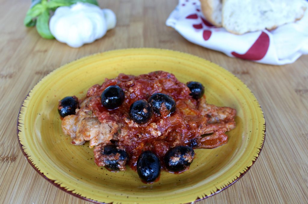 The preparation is really simple: just place the chops in a pan, drizzle the oil over all the meat, add the salt, chili pepper, tomato pulp, coarsely chopped garlic, and olives. Cover with the lid and cook over high heat. After about 7-8 minutes, turn the meat, add the basil, and continue cooking for another 7-8 minutes. The chops are ready when they are tender, the sauce has reduced, and the natural cooking fat has concentrated along the edge of the pan.