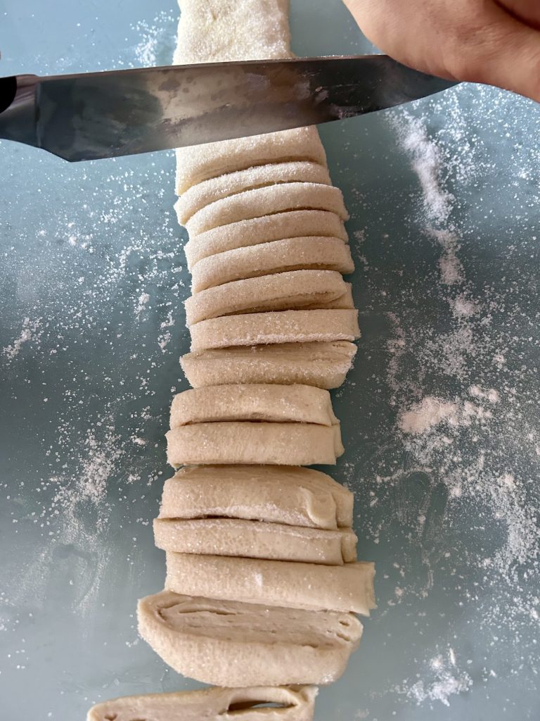 • Once you reach the center, overlap the two halves to obtain a single roll and start cutting it into equal strips to ensure even cooking. Use a good straight-edge knife for this operation because you need to cut them without squashing them too much.