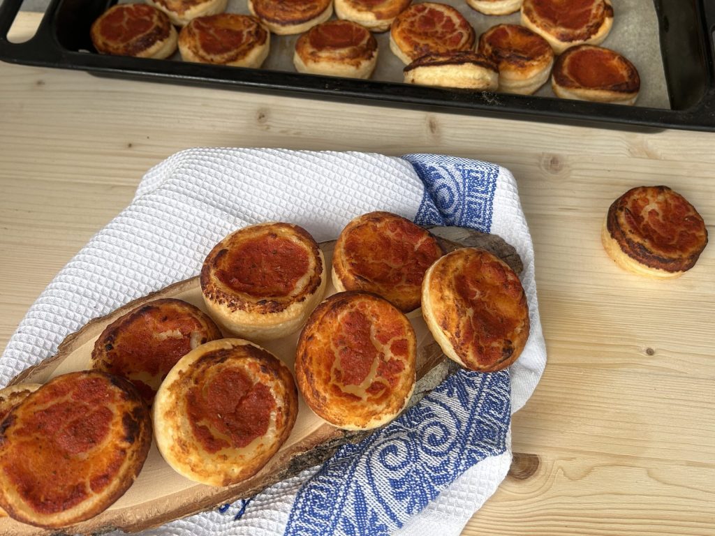 • The preparation of puff pastry mini pizzas is simple and quick; just roll out the pastry, cut it, and cover it with a teaspoon of tomato, then bake and enjoy!