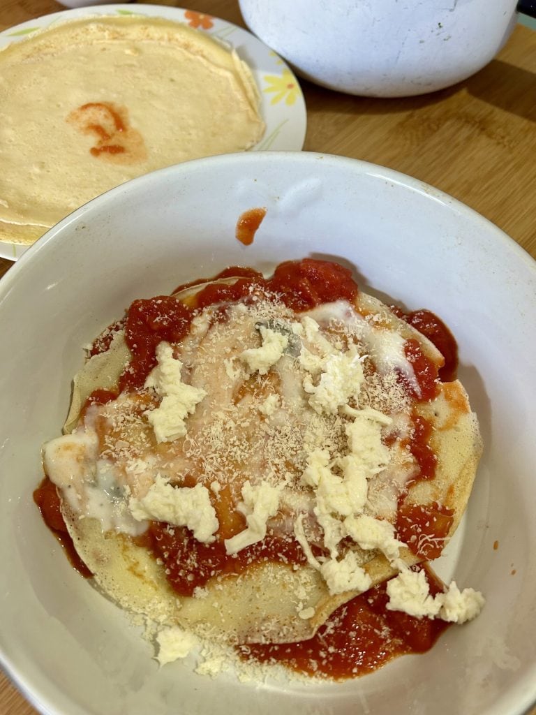 Once the béchamel is also prepared (which, if you prefer, you can buy ready-made), we are ready to assemble. Start by putting some sauce on the bottom of the baking dish, then add a layer of crepes. Repeat with another layer of sauce, a bit of béchamel, a sprinkle of parmesan, and some pieces of mozzarella. Continue layering until all ingredients are used up.