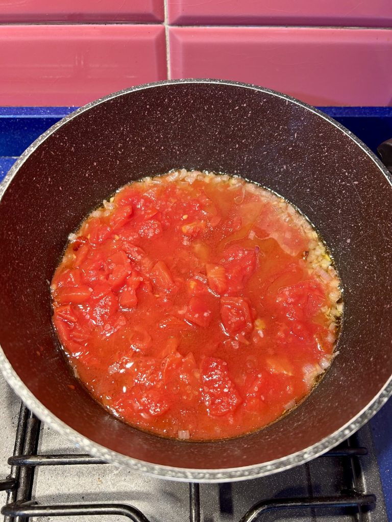 Let’s start by preparing the sauce: chop the onion and, in a small pot, add oil and chili pepper. Let it fry until the onion turns golden. At this point, add the tomato pulp, the salt, and cover with the lid. Let it cook for about 15 minutes on moderate heat, stirring occasionally.