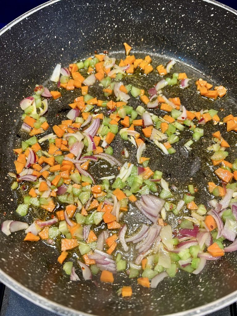 After cutting the rabbit, clean the onion, carrot, celery, and garlic cloves, chop them coarsely on a cutting board. Put the 2 tablespoons of oil in the pan and brown garlic, onion, carrots, and celery with a bit of chili if you like, or add pepper while the rabbit cooks.