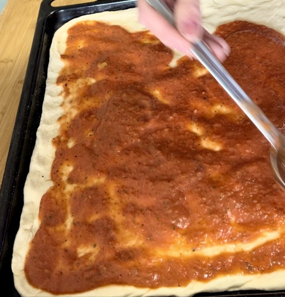 Red pizza in a tray is the classic pizza we find at the bakery: thin, soft, topped with good tomato, salt, pepper, oil, and oregano.