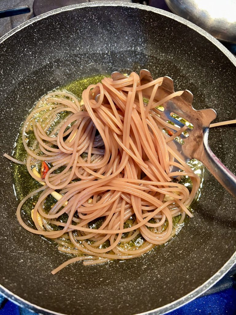 • While the pasta is cooking, put the extra virgin olive oil specified in the recipe, coarsely chopped garlic, chili pepper, and a pinch of salt into the non-stick pan. Sauté until the garlic is golden and then turn off the heat.