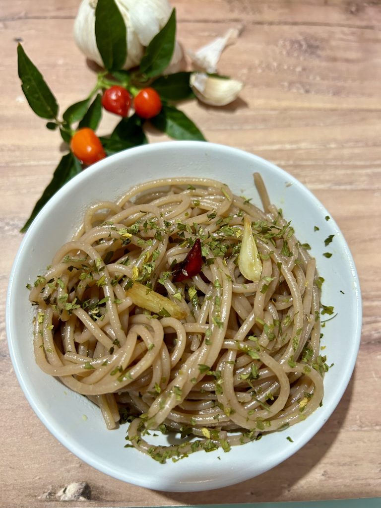 Red wine spaghetti is a special recipe with a slightly acidic taste enriched by the seasoning of garlic, oil, and chili pepper in which the pasta is tossed after cooking. The color of this dish can be very scenic, ranging from pinkish to intense red depending on the amount of wine you use in the cooking. You could cook directly in wine, but it’s always good to dilute it with water for a less acidic flavor; I recommend using double the amount of water compared to the wine used, making the acidity practically imperceptible.