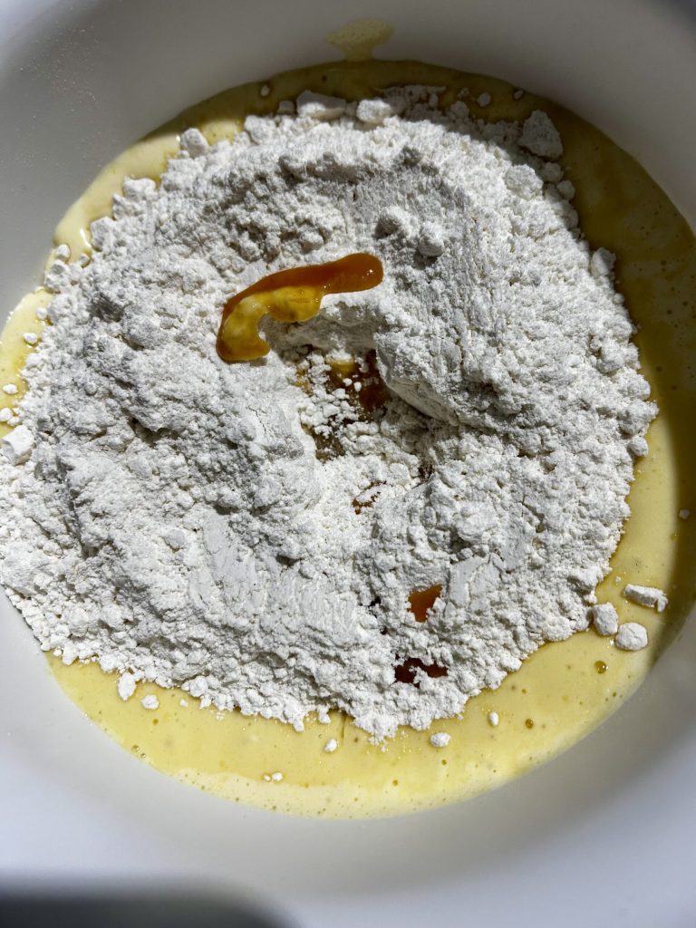 Before adding an ingredient, wait for the previous one to be well incorporated. As you see, the mixture will be a soft but well-compact batter.