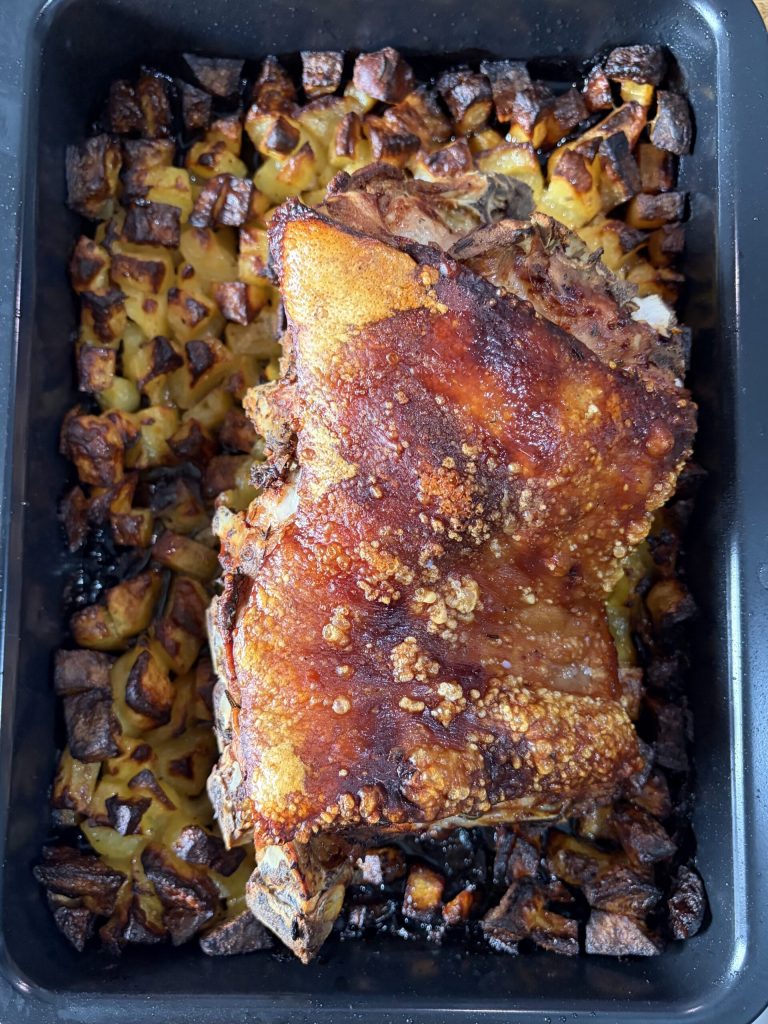 I arrange the potatoes in the baking pan and place the piglet in the center, with the rind facing down for the first part of the cooking. I bake at 446°F for about an hour and a half, then turn the piglet to beautifully brown and crisp the skin.