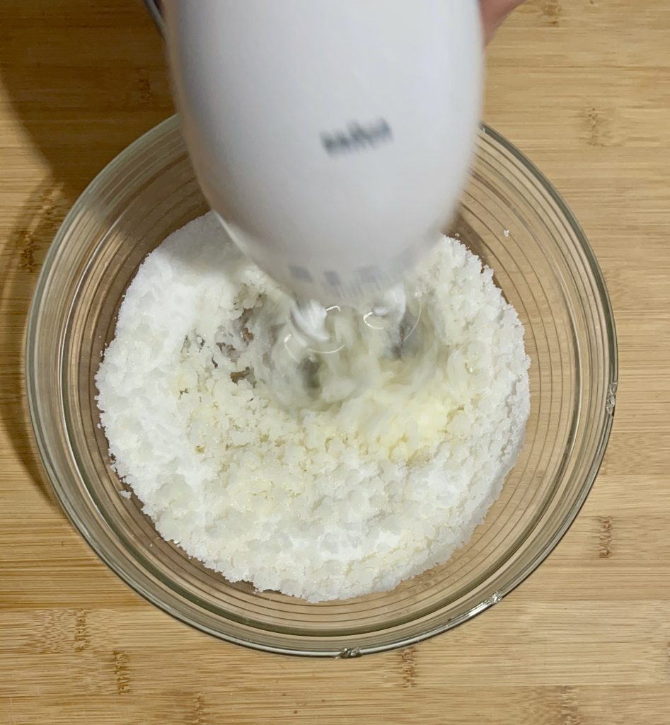 • First, pour the yogurt into a large bowl. We will always use the yogurt jar as a measuring unit, so no need for a scale. Then add 2 jars of sugar and start working the mixture with the electric whisk until it becomes creamy and homogeneous.