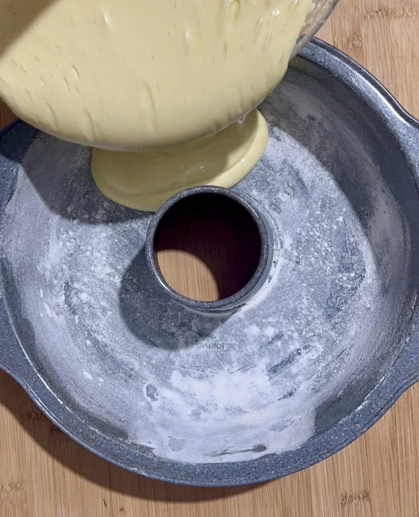 • When the batter is ready, pour it into the pre-greased and floured bundt pan. Immediately bake in a preheated oven at 340°F and let it cook for about 40 minutes. After the first 35 minutes, it’s always good to do the toothpick test because each oven has its own power and cooking times may vary: if the toothpick comes out dry, our soft 7-jar cake is ready to be taken out of the oven.
