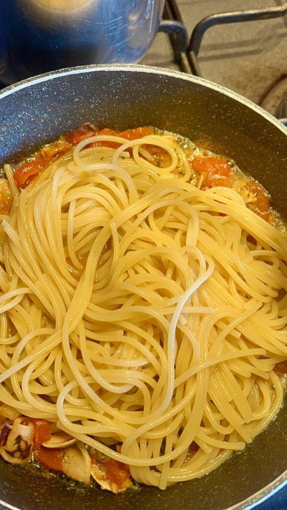 Put a pot of plenty of salted water on the stove: you’ll need it to cook the spaghetti as soon as the sauce is ready. Meanwhile, in a high-sided pan – so you can also use it to toss the pasta – pour a drizzle of extra virgin olive oil, add a chopped garlic clove, and the chili pepper. Let it sauté over medium heat until the garlic becomes golden. At this point, add the still frozen mixed seafood, cover with a lid, and let it cook over high heat for about 5 minutes: the fish will begin to thaw and release its natural water, creating a tasty base for the sauce.