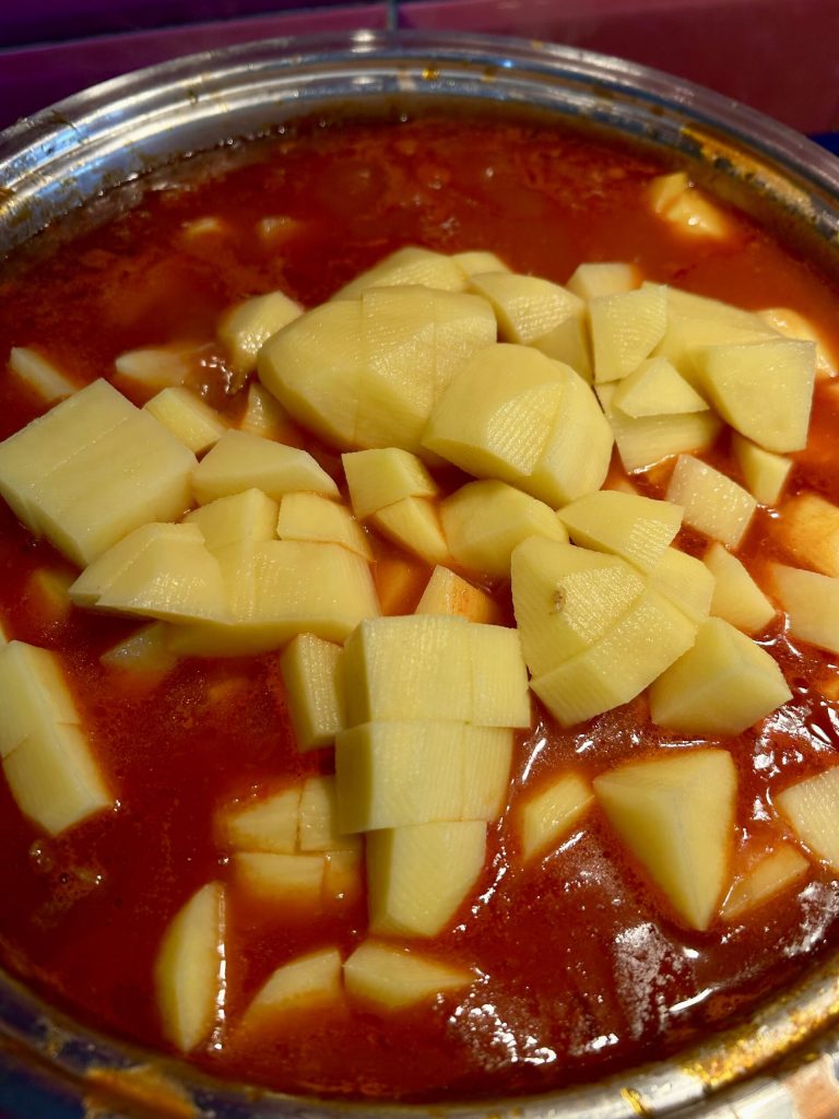 Meanwhile, peel the potatoes and cut them into not too small pieces. Add them to the pot, stir gently, and cover with the lid. Cook over moderate heat for about 2 and a half hours, stirring occasionally.