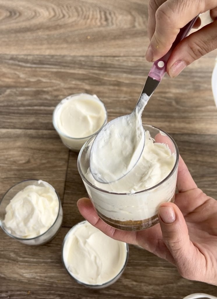 • With the prepared cream, cover all the bases trying to press the cream with the back of the spoon to fill all the empty spaces above the biscuit base and smooth the surface as best as possible.