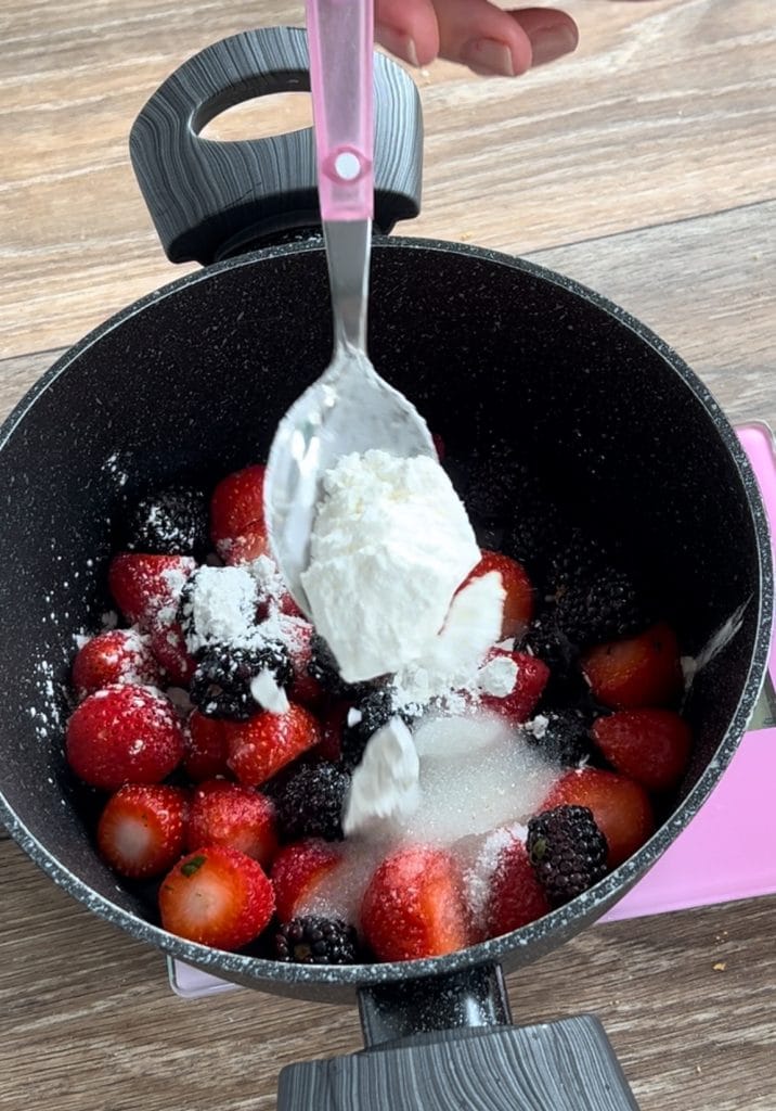 • In a saucepan, pour the strawberries and raspberries after cleaning and washing them, add the sugar, lemon juice, and cornstarch. Coarsely mix with a spoon and place on the stove, using a lid for cooking. After a few minutes, the fruit will have become soft; lower the heat so it doesn’t burn, and finally blend with a mixer directly in the pot. Keep the fruit on the fire until it thickens; it should take about 5 minutes or a little more. Remember that it will thicken further as it cools.