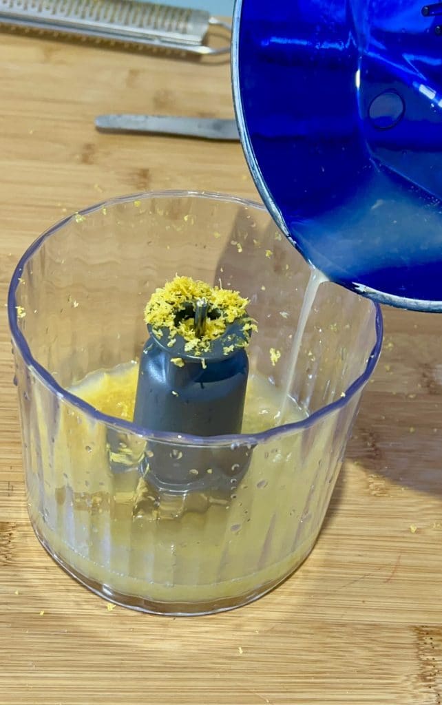 First, we wash the lemons well because we will use the zest. Grate the yellow part of the zest and put it in the food processor. Then squeeze the lemons and add the juice as well.