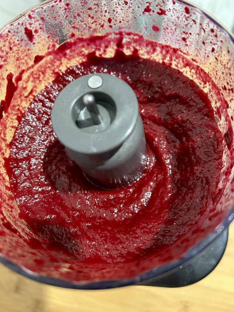 The first step is to blend the beetroot with the food processor until you obtain a homogeneous pulp. Usually, nothing needs to be added, but if you notice that the beetroot does not easily turn into cream, you can add part of the oil provided for in the recipe to make the operation easier.