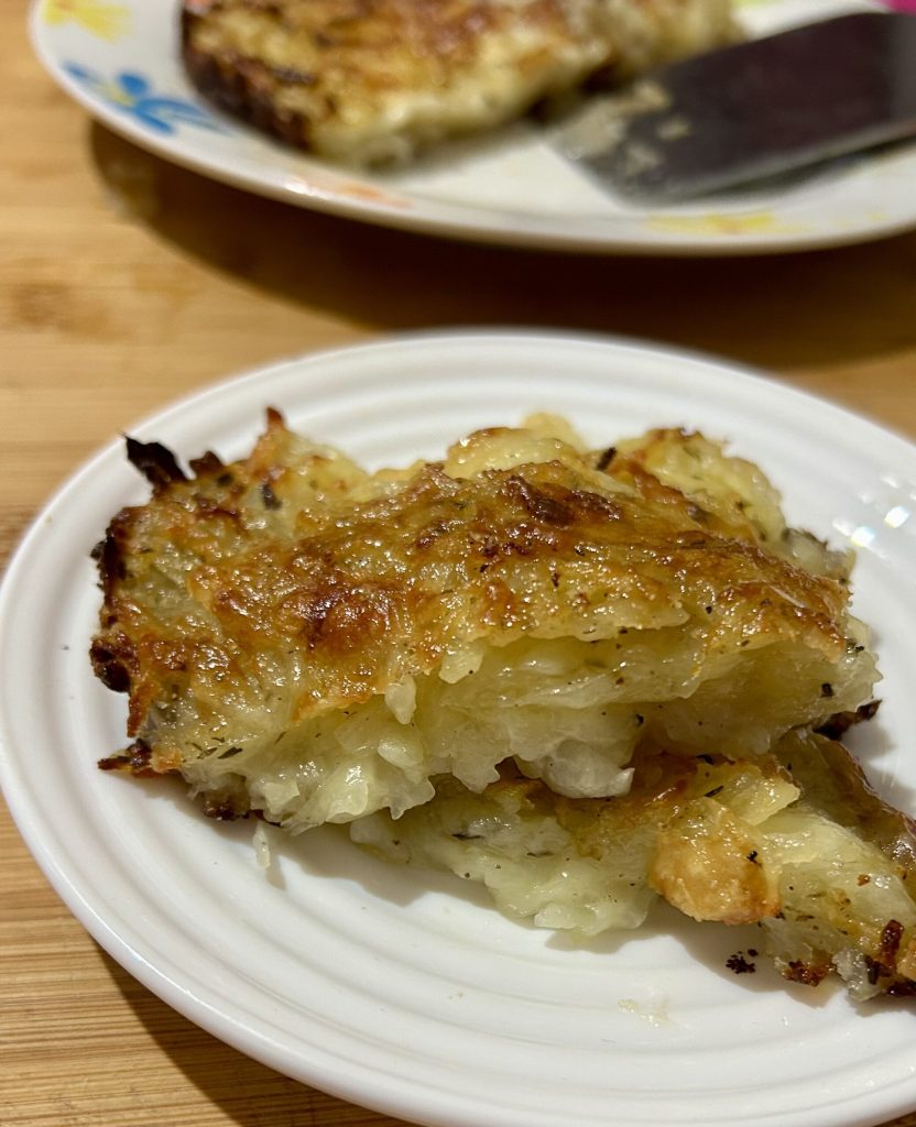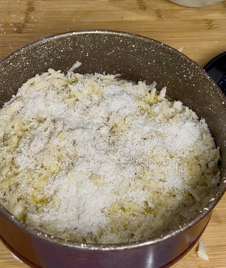 Just like him, this recipe is simple but with an unexpected twist: I used julienne-cut potatoes, seasoned them well, and transformed them into a sort of crispy and stringy rösti. In the center, a heart of mozzarella melts with the heat, while on the surface, grated parmesan creates an irresistible golden crust. The result? A special potato, perfect as an appetizer, vegetarian main, or a treat for a dinner with friends.