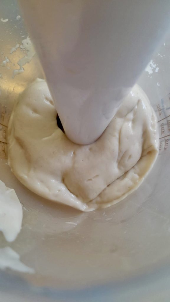 Place the saucepan with the mixed ingredients on medium/low heat and cook, stirring until it reaches a custard-like consistency (as seen in the photo). Turn off the heat and let it cool; to speed up this process, remove it from the saucepan and immediately transfer it to a tall container like a measuring cup.