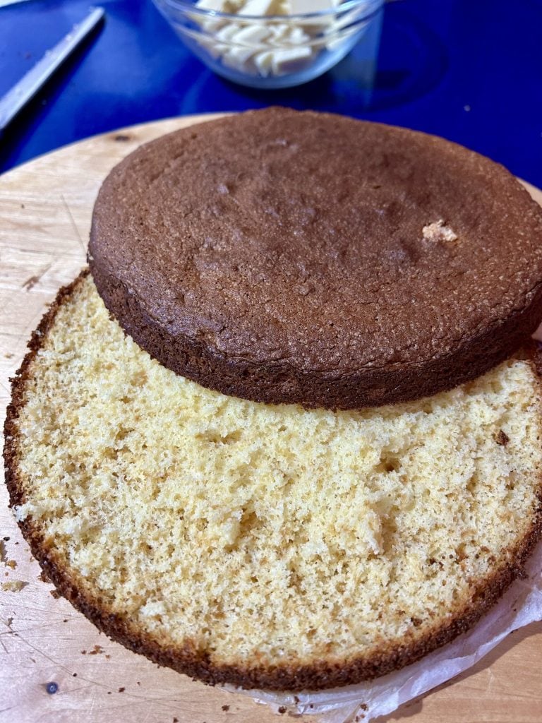 Let the cake cool thoroughly before slicing it horizontally into two parts. Use a good bread knife to facilitate this operation.