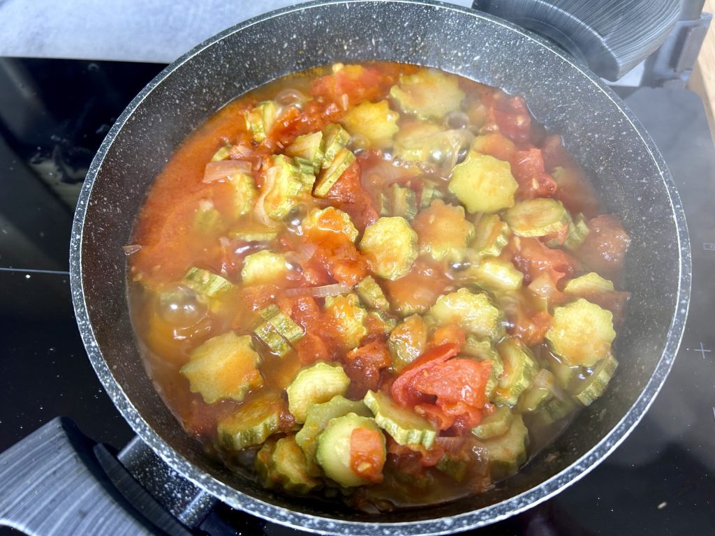 Add the tomato pulp, thinly sliced shallots, salt, chili pepper, oil, and water. Cover with the lid and bring to a boil over high heat, then lower the heat a bit and stir occasionally until the cooking is completed. Add the tomato paste halfway through cooking. The zucchini are done when they are soft, and the sauce has thickened sufficiently. If the zucchini are cooked and the sauce is too thin, remove the lid and raise the heat to thicken it. If the zucchini are still tough and the sauce is too thick, add a splash of water and continue cooking. At the end of cooking, add the basil leaves.