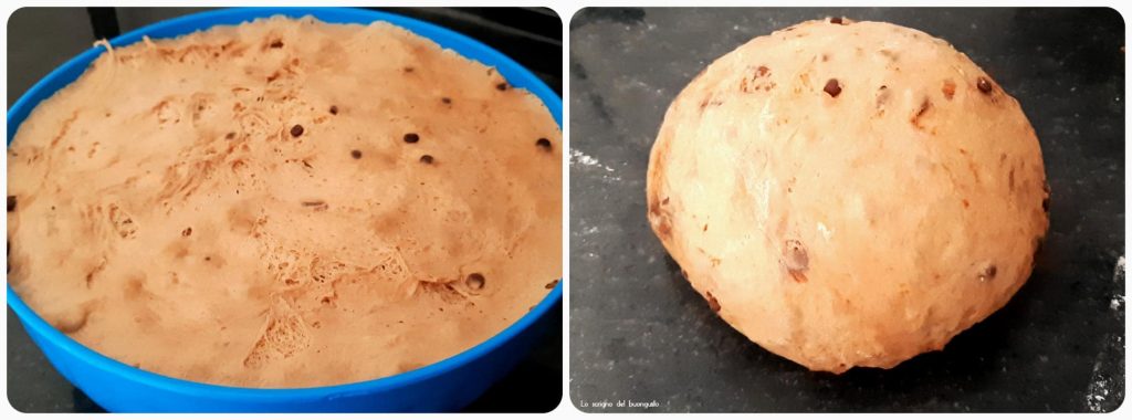 Let knead for about 30 minutes, then add the chocolate chips and work the dough for a maximum of 2 minutes, so the chocolate does not heat up too much, as it releases some color to the dough.