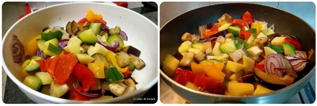 Take a non-stick pan with high edges, put a drizzle of extra virgin olive oil, sauté the onion, then add the potatoes, and then add the other vegetables.