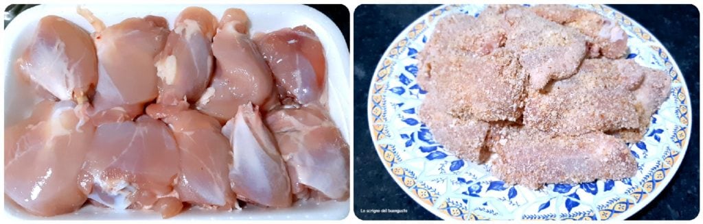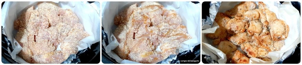 • Put the 4 tsp of e.v.o. oil on one plate and the breadcrumbs on another, brush the chicken with the oil and then coat it in the breadcrumbs. Once prepared, prepare the air fryer with foil and parchment paper or cook in contact with the basket if you prefer.