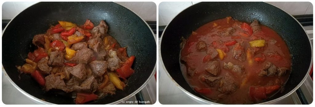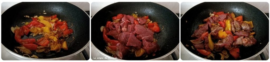 In a non-stick pan with high edges, sauté the onion with the extra virgin olive oil for about 3 minutes, then add the peppers previously washed, seeded, and cut into pieces.