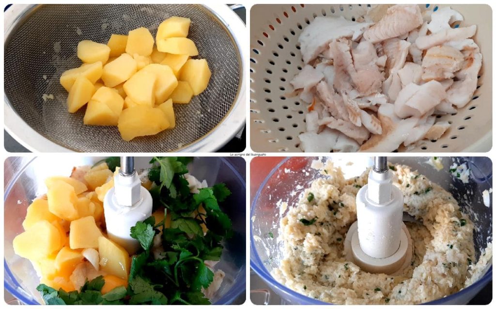 Once everything is cooked and drained, place the potatoes and cod into the food processor, add the washed and dried parsley, salt, egg, oil, garlic, and blend everything.
