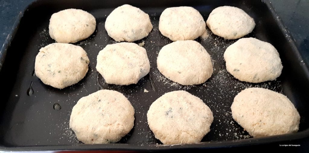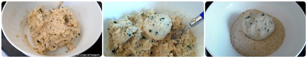 In a container, put the breadcrumbs, then form balls with the fish-based mixture, roll them in the breadcrumbs, round them with your hands, and then flatten them a bit.