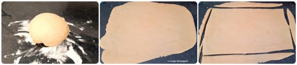 Take a portion of the dough and roll it out into a thin but not too thin sheet; it can also be worked with a pasta machine, flouring it well.