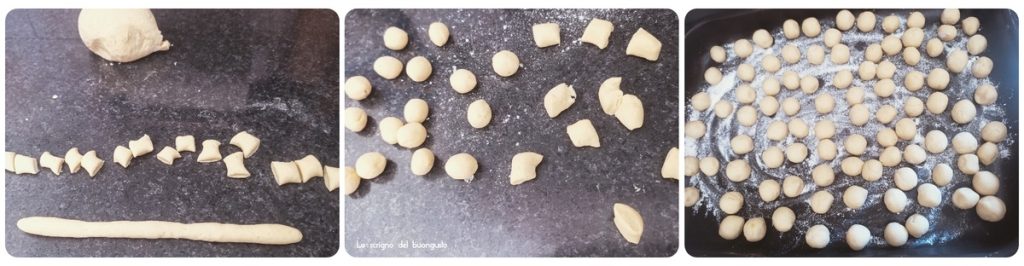 Transfer the dough to a lightly floured work surface, roll it into ropes, cut them into pieces to create gnocchi, and shape each piece into little balls… I chose to make them round instead of leaving them in the classic gnocchi shape.