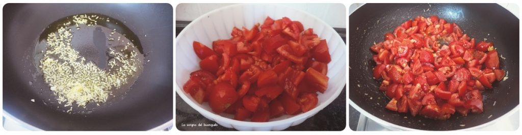 In a nonstick pan put the crushed garlic with the oil, let it turn golden, then add the washed and chopped tomatoes.